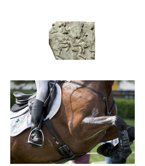 Still Seeking Athena, is composed of group four horse-and-rider combinations that have been paired with portions of the Elgin Marbles. The horse and rider, and the images on the marbles, become progressively more energized as the goal of Seeking Athena, by flying up to her, is represented in both sets of images.